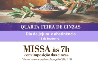 Missa de Quarta-feira de Cinzas - Dia de Jejum e abstinência. Missa às 7h com a imposição das cinzas.